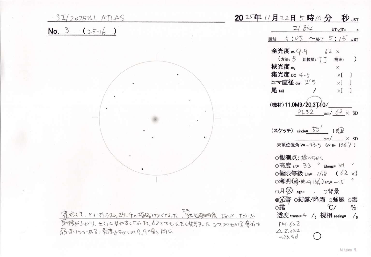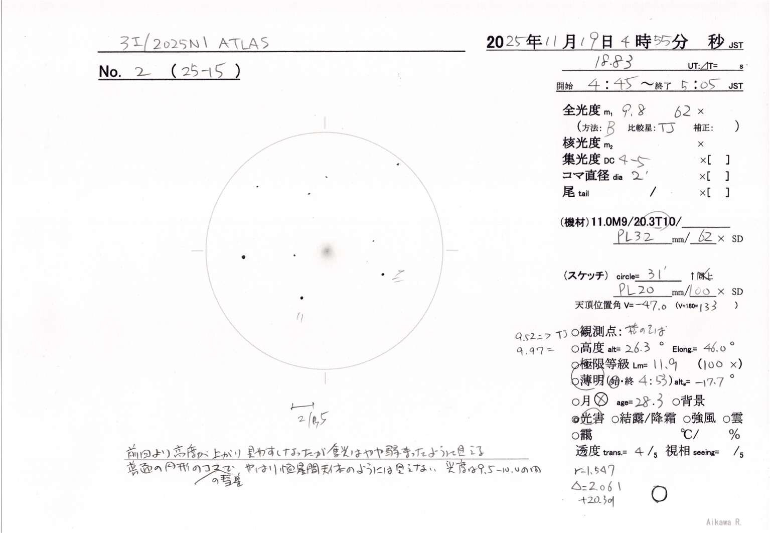 寝坊してC/2025 K1アトラス彗星のスケッチの時間がなくなった。この3Iも薄明後だがだいぶ高度が上がりさらに見やすくなった。20cm62倍でも大きく拡散したコマがわかる。集光は弱まりつつある。光度は近くの9.9等星と同じ。