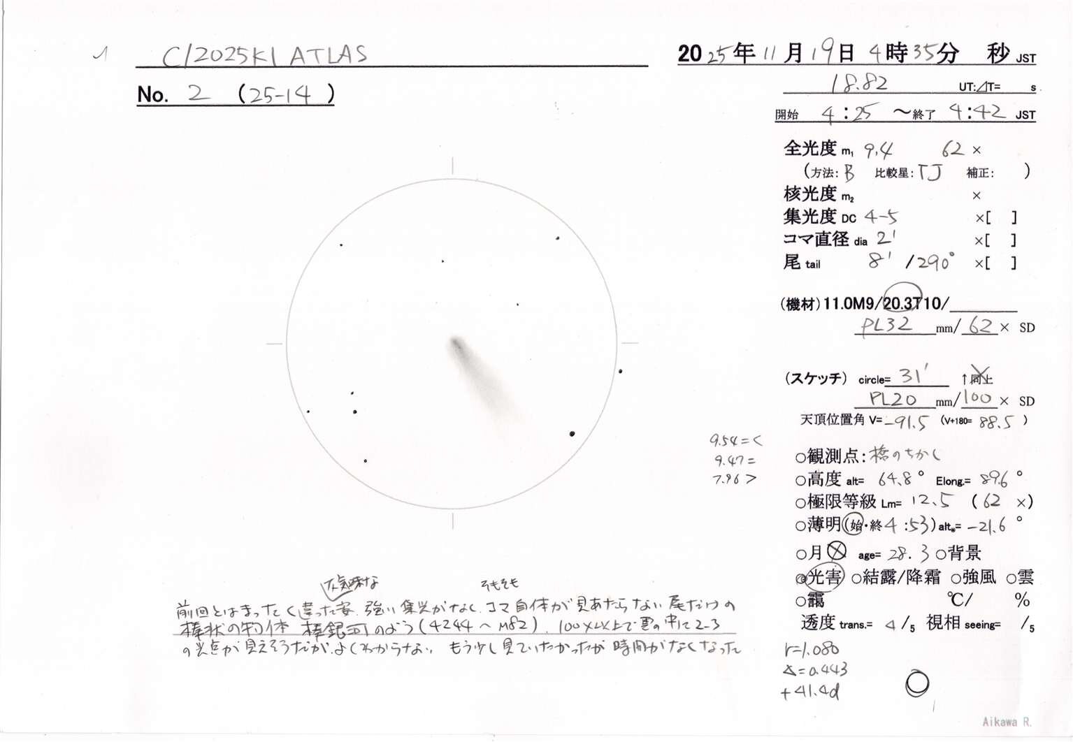 仕事の10分の休憩時間を利用してやっと見ることができた。C/2025 A6と比べると暗く、5cm双眼鏡ですんなりとはいかないが、一度見つけると見やすい。C/2025 A6よりもコマが大きく集光は弱い。尾がごくかすかにある気もするが??光度は5.9等星と6.3等星の中間ぐらい。もっとじっくりと見たかった。