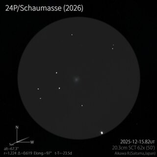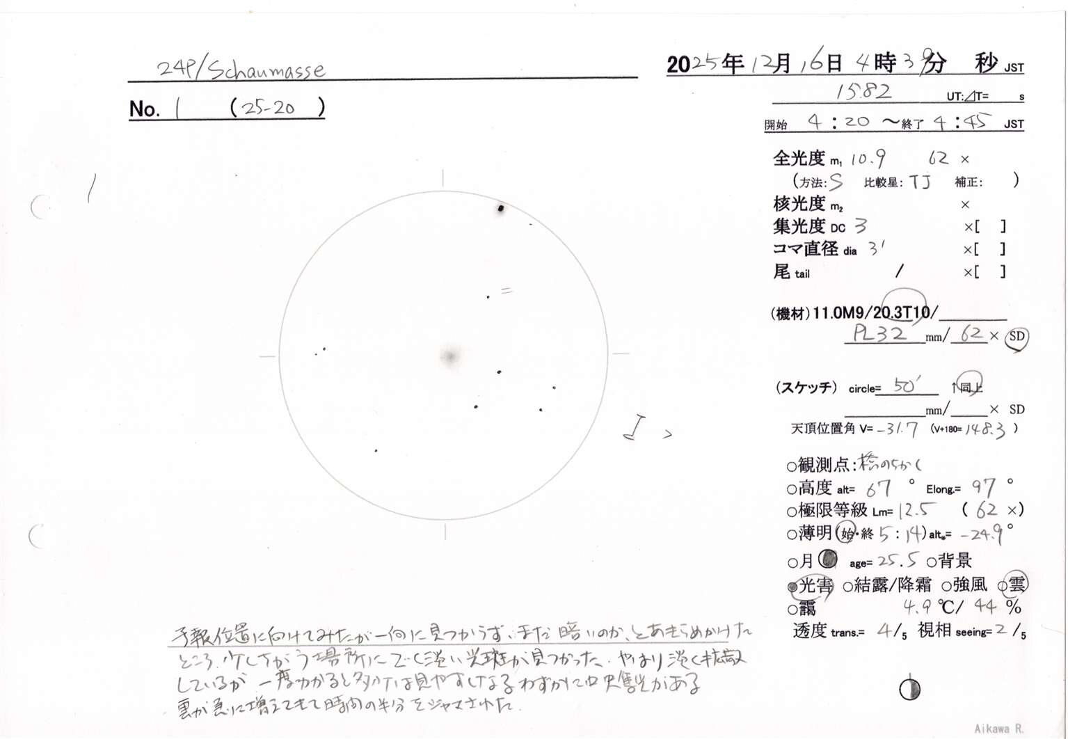 予報位置に向けてみたが一向に見つからずまだ暗いのかと諦めかけたところ、少し違う位置にごく淡い光斑が見つかった。やはり淡く拡散しているが、一度わかると多少は見やすくなる。わずかに中央集光がある。雲が急に増えてきて時間の半分を邪魔された。