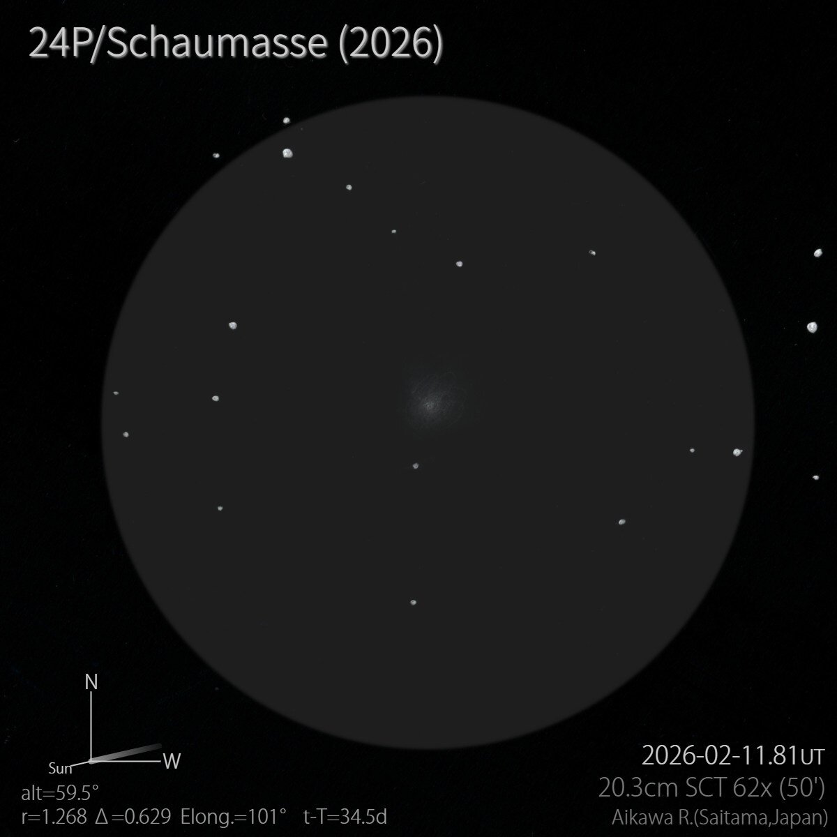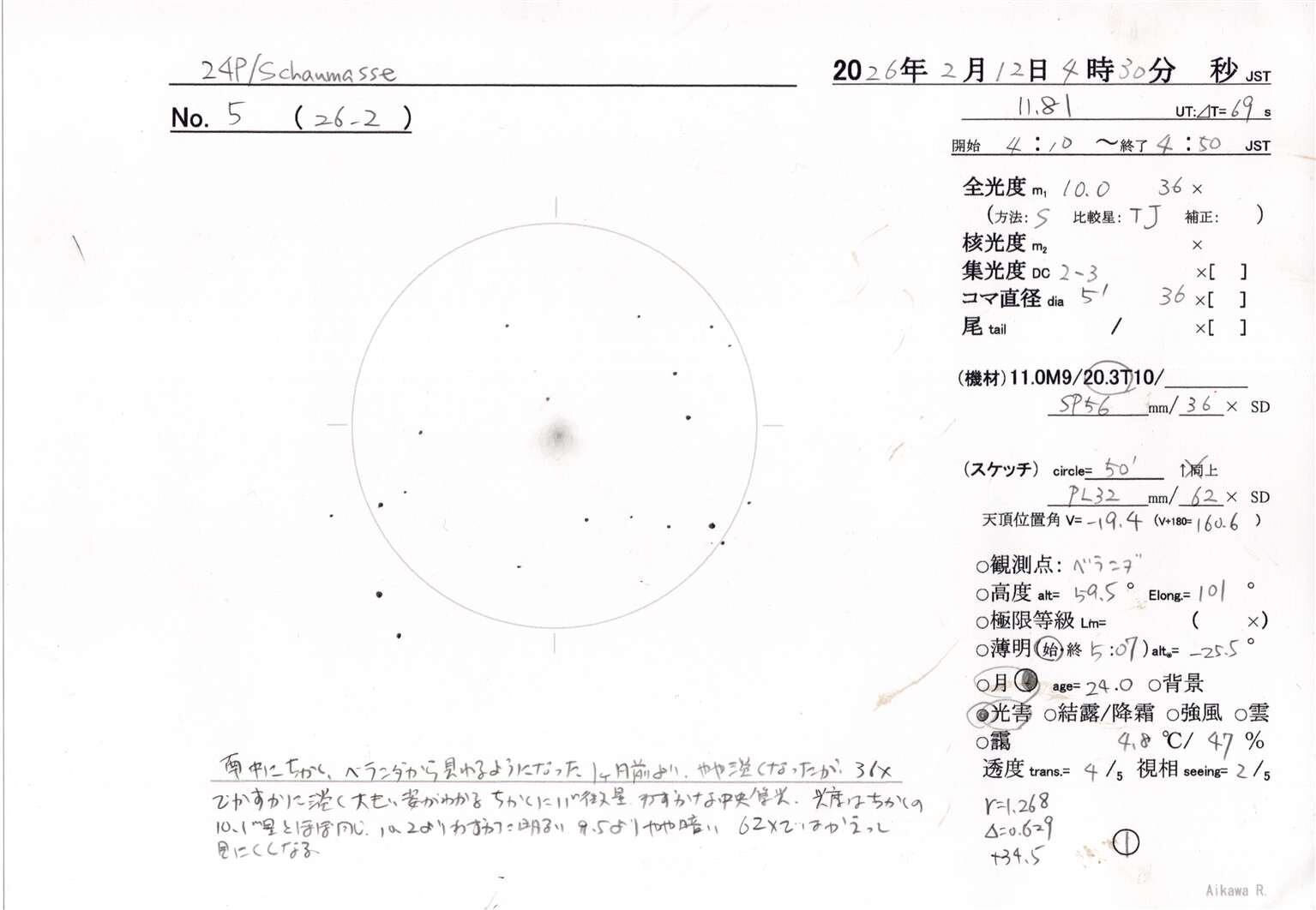 24P/Schaumasse (2026) IIIYYYYMnL YYYY MM DD.DD eM/mm.m:r AAA.ATF/xxxx /dd.ddnDC /t.ttmANG ICQ XX*OBSxx 24 2026 02 11.81 S 10.0 TJ 20.3T10 36 5 2/ ICQ XX AIK