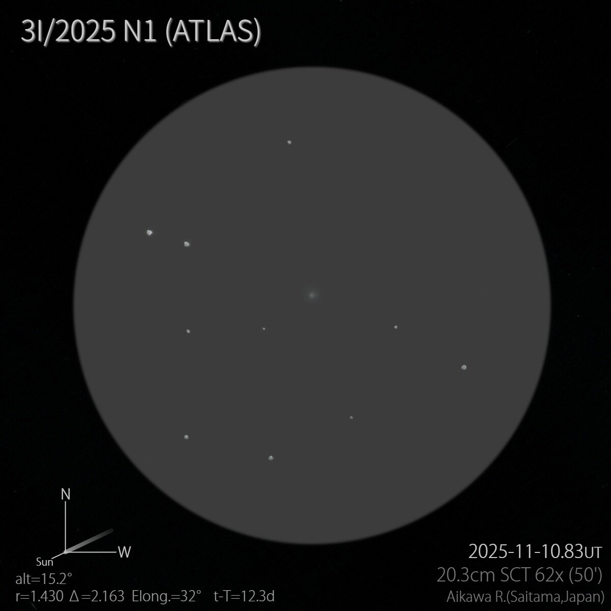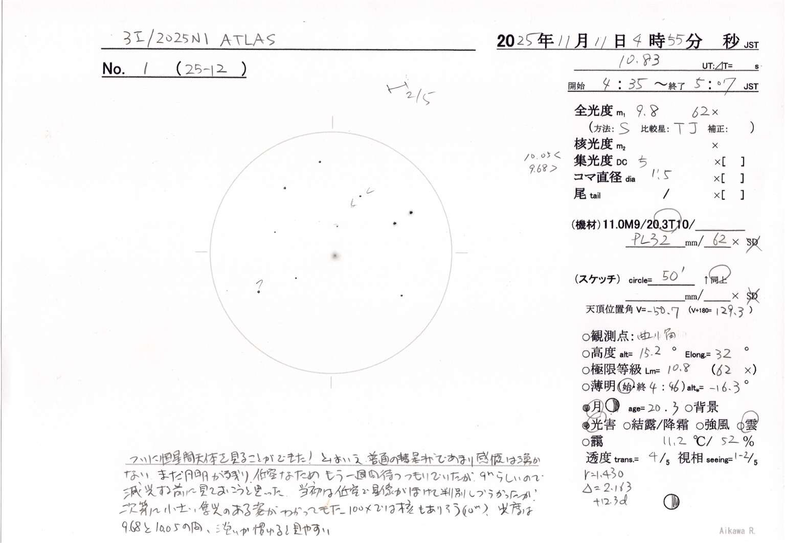 ついに恒星間天体を見ることができた!とはいえ、普通の彗星状であまり感慨は湧かない。まだ月明が残り、低空なためもう1週間待つつもりでいたが、9等級らしいので減光する前に見ておこうと思った。当初は低空で星像がぼやけ判別しづらかったが、次第に小さい集光のある姿がわかってきた。100倍では核もありそう(10等)。光度は9.68等と10.05等の間。淡いが慣れると見やすい。