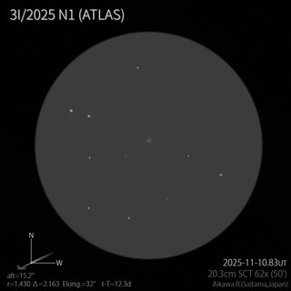 ついに恒星間天体を見ることができた!とはいえ、普通の彗星状であまり感慨は湧かない。まだ月明が残り、低空なためもう1週間待つつもりでいたが、9等級らしいので減光する前に見ておこうと思った。当初は低空で星像がぼやけ判別しづらかったが、次第に小さい集光のある姿がわかってきた。100倍では核もありそう(10等)。光度は9.68等と10.05等の間。淡いが慣れると見やすい。