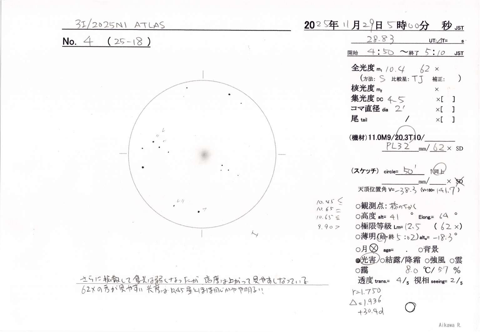 3I/ATLAS IIIYYYYMnL YYYY MM DD.DD eM/mm.m:r AAA.ATF/xxxx /dd.ddnDC /t.ttmANG ICQ XX*OBSxx 3I 2025 11 28.83 S 10.4 TJ 20.3T10 62 2 4/ ICQ XX AIK