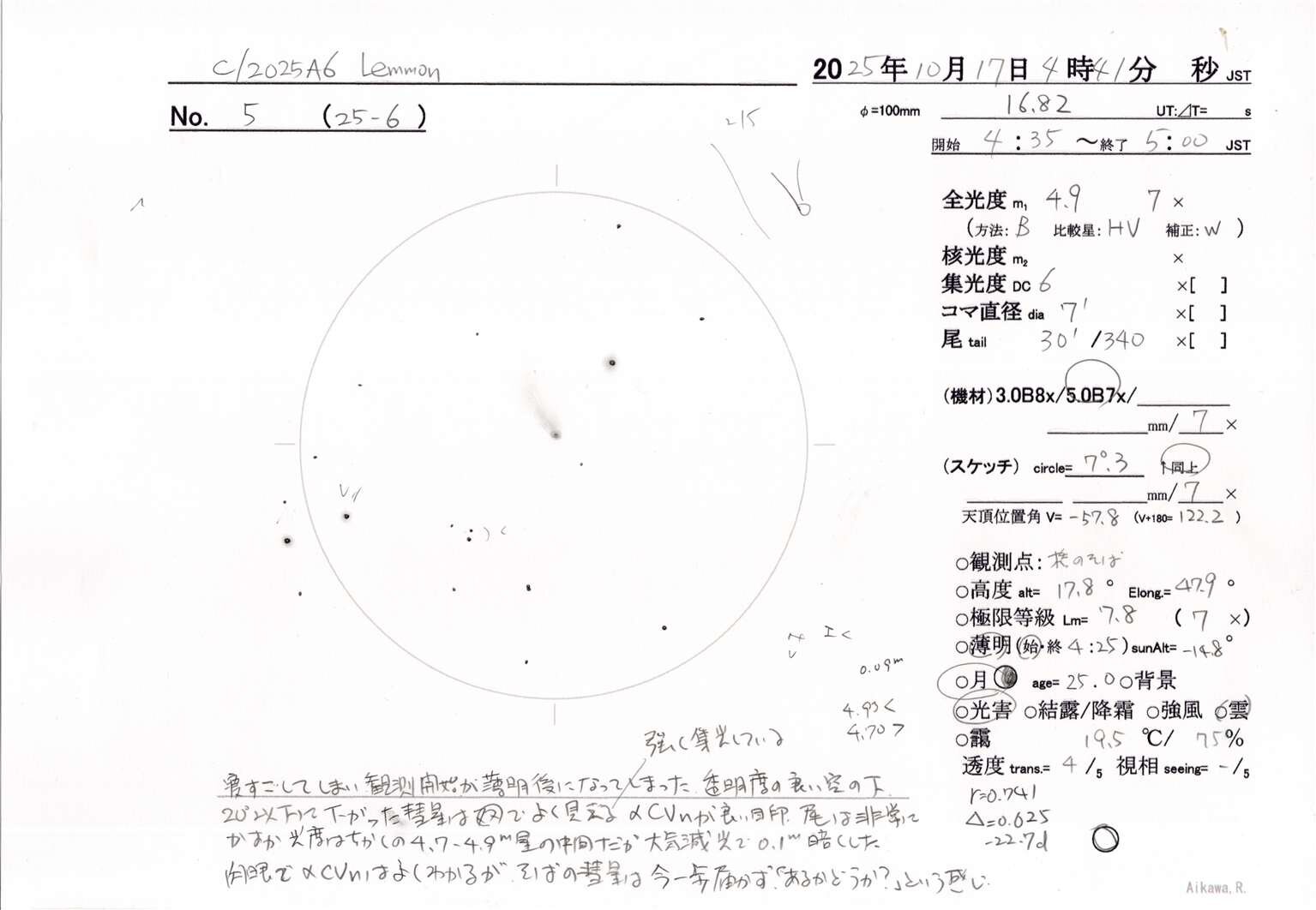 雲が広がり諦めて荷物をまとめた頃に晴れ間が再び出てきたため、双眼鏡スケッチも描けることになった。細い尾が5.2等星の3分の1あたりまでは見える。かなりかすかだが。コマは10月2日の時より大きい。明るさは近くの5.2等星と6.6等星の合成等級とほぼ同じか、わずかに明るい。5.7等星よりは確実に明るい。