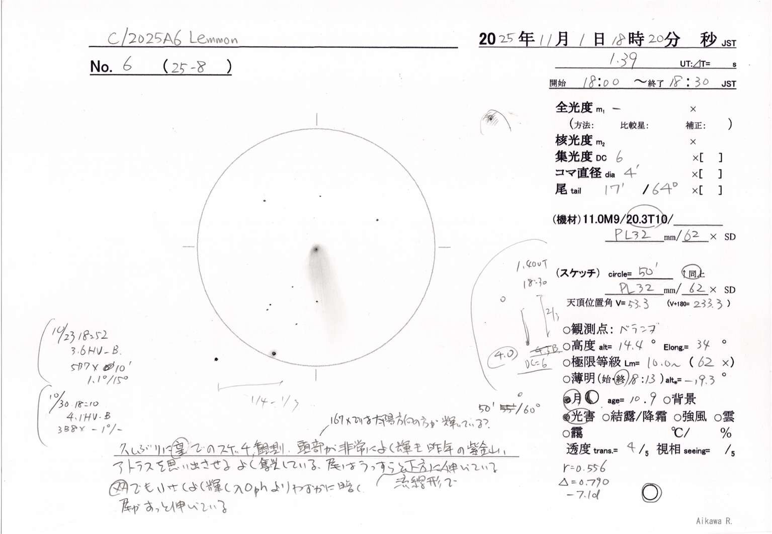 久しぶりに望遠鏡でのスケッチ・観測。頭部が非常によく輝き、昨年の紫金山・アトラス彗星を思い出させる。よく集光し、167倍では太陽方向の方が輝いているようにも見える。尾はうっすらと流線形で下方に伸びている。双眼鏡でも小さくよく輝く。λOph(合成等級3.8等)よりわずかに暗い。尾がすっと伸びている。