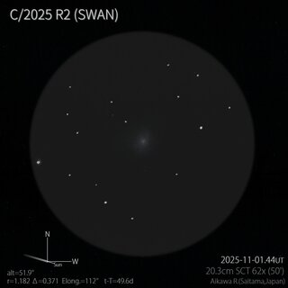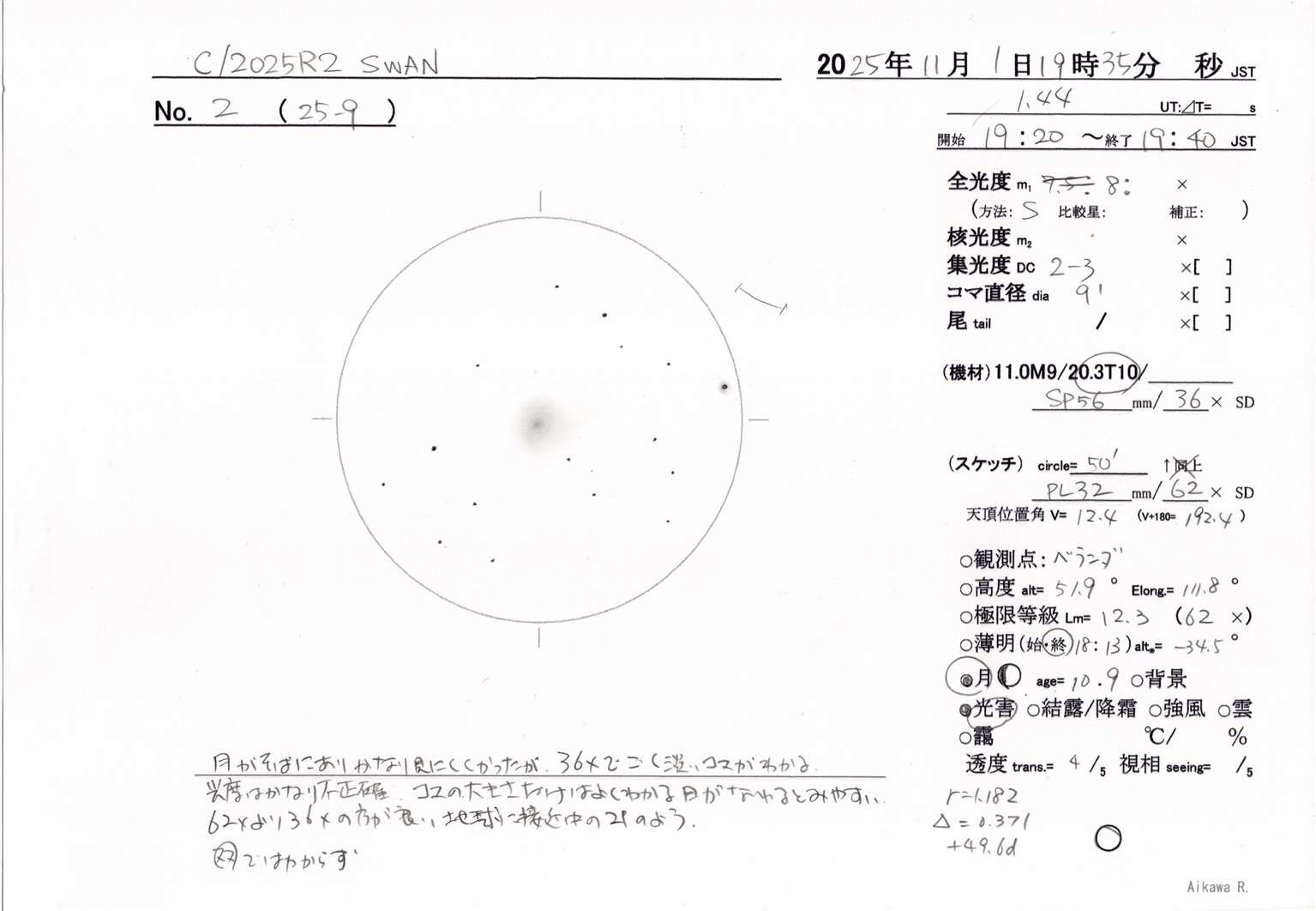 月がそばにありかなり見にくかったが20cm36倍でごく淡いコマがわかる。光度はかなり不正確。コマの大きさだけはよくわかる。目が慣れると見やすい。62倍より36倍の方が良い。地球に接近中の2Pのよう。